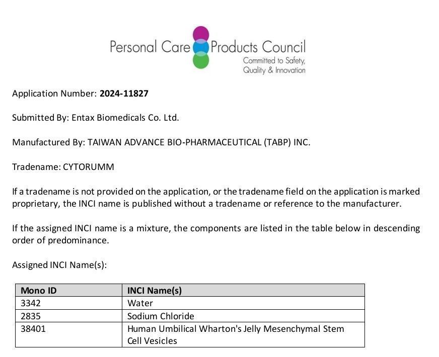 據衛福部2024年健康趨勢報告,台灣抗衰保健品市場規模已突破70億元。尖端醫(4186)研發的外泌體生長因子原料,在今年4月初已正式通過國際化妝品原料命名(INCI)認證,品質與技術實力獲得國際肯定,也為未來拓展跨國市場奠定關鍵基礎。