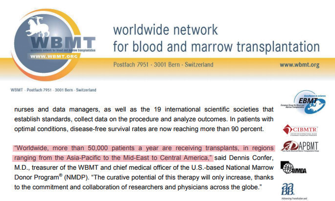 「全世界,從亞太平洋地區到中東,再到中美洲,每年有超過五萬人接受移植治療」,NMDP首席醫療官Dennis Confer說(註1)。從1988年法國第一例臍帶血成功移植案例至今,全球移植案例不斷增加。單就日本而言,移植案例目前已累積超過一萬五千筆(註2)。